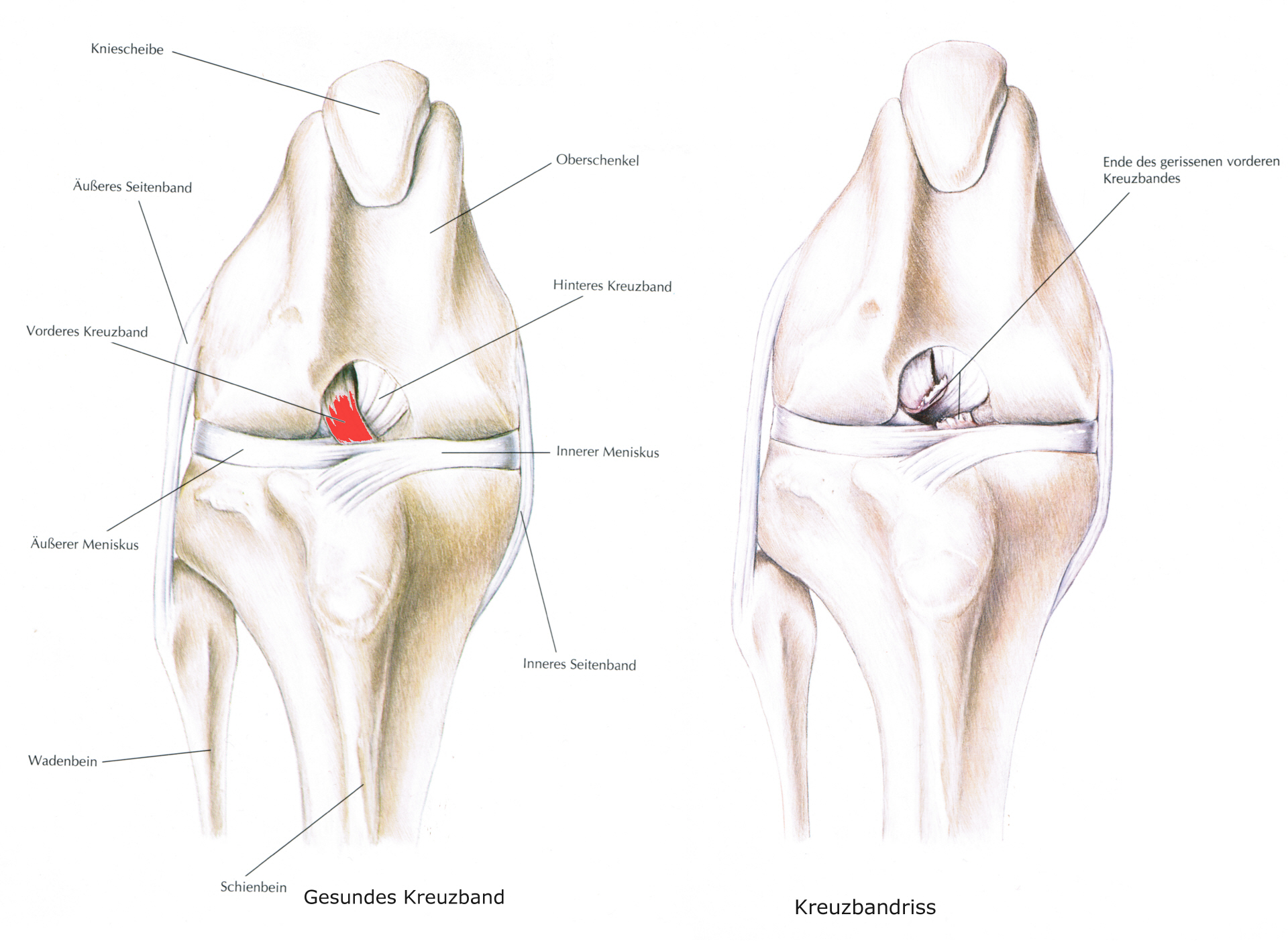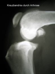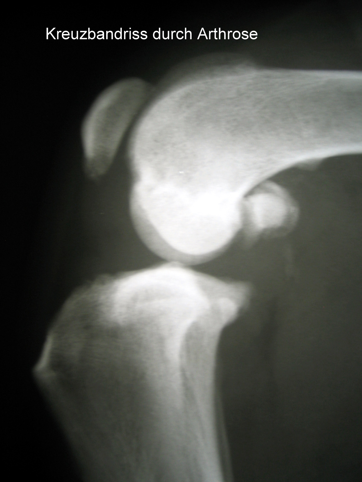 Der Kreuzbandriß beim Hund ist im Gegensatz zum Menschen in 90 % der Fälle nicht durch einen Unfall verursacht sondern eine Folge von degenerativen Prozessen im Gelenk wie z. B. einer Gelenksarthrose. Begünstigt wird diese Erkrankung z. B. durch Übergewicht. Deshalb geht der betroffene Hund meistens ohne deutlich erkennbare Ursache plötzlich lahm. Beim Neufundländer und Boxer ist eine genetische Anlage bewiesen. Generell gilt aber, dass vor allem ältere kastrierte Hündinnen (> 6-7 J) mit Übergewicht betroffen sind. Die betroffenen Tiere zeigen eine zumeist deutliche Lahmheit am betroffenen Hinterbein. Die Diagnose wird beim Tierarzt durch eine Ganganalyse, den Sitztest, eine umfassende klinische Untersuchung (z. B. Schubladenphänomen, Tibiakompressionstest) und Röntgendiagnostik gestellt. Eine Röntgenuntersuchung in mind. 2 Ebenen ist zwingend erforderlich um weitere Erkrankungen (z.B. eine Arthrose oder eine OCD) festzustellen.
