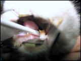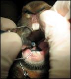Diagnose und Behandlung: Um eine Zahnerkrankung diagnostizieren zu können , muss die Maulhöhle sorgfältig untersucht werden. Ein exakter Überblick kann jedoch nur unter Sedierung / Narkose des Tieres erfolgen. Sollten sich Zahnspitzen oder Fehlstellungen finden, müssen Röntgenbilder angefertigt werden. Überwachsene Scheidezähne werden mit einer Trennscheibe / Fräser gekürzt. Das Abknipsen mit einer Zange führt meist zum Splittern der Zähne und sollte vermieden werden. Spitzen und Kanten an den Backenzähnen sowie überwachsene Backenzähne werden mit einer speziellen Fräse abgeschliffen.